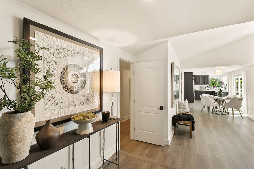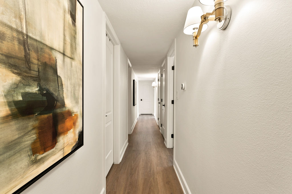 The hallway connecting the rooms features a modern light fixture and a framed abstract artwork, adding subtle elegance to the transition between areas. This design is perfect for those who enjoy a contemporary aesthetic with a focus on comfort, elegance, and natural light. The seamless integration of stylish furniture, modern décor, and practical layout ensures that every room serves both a functional and aesthetic purpose, making this home a true representation of refined living.