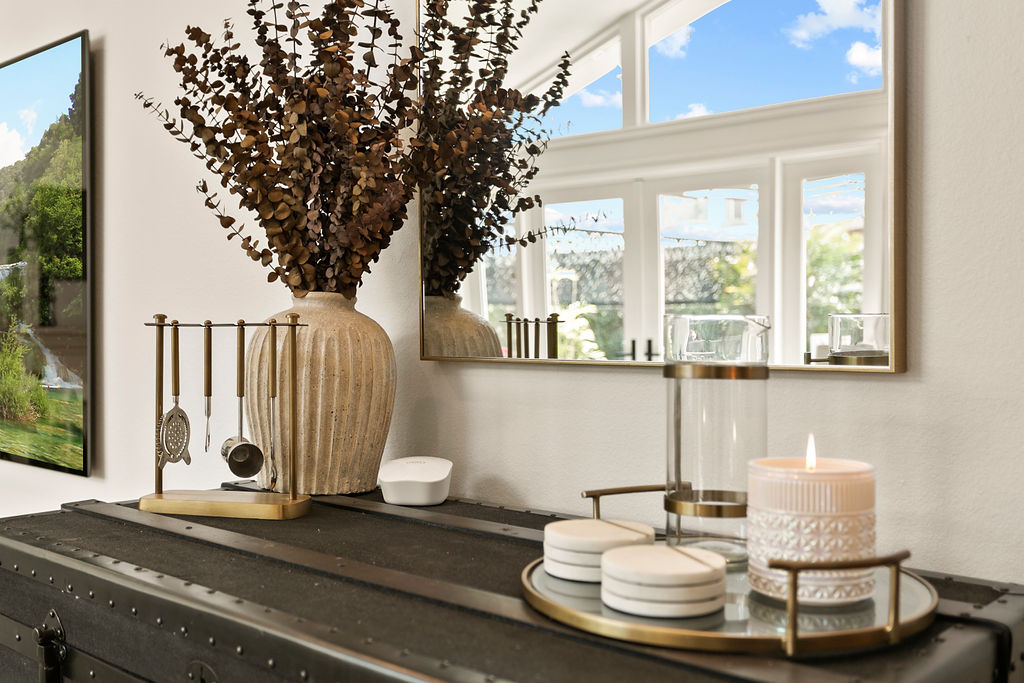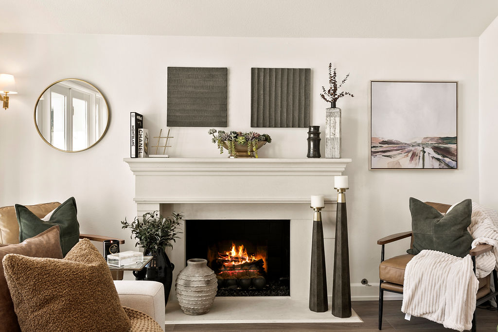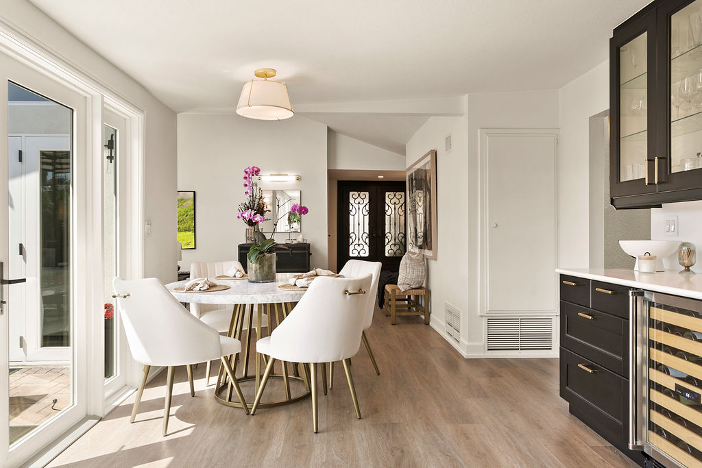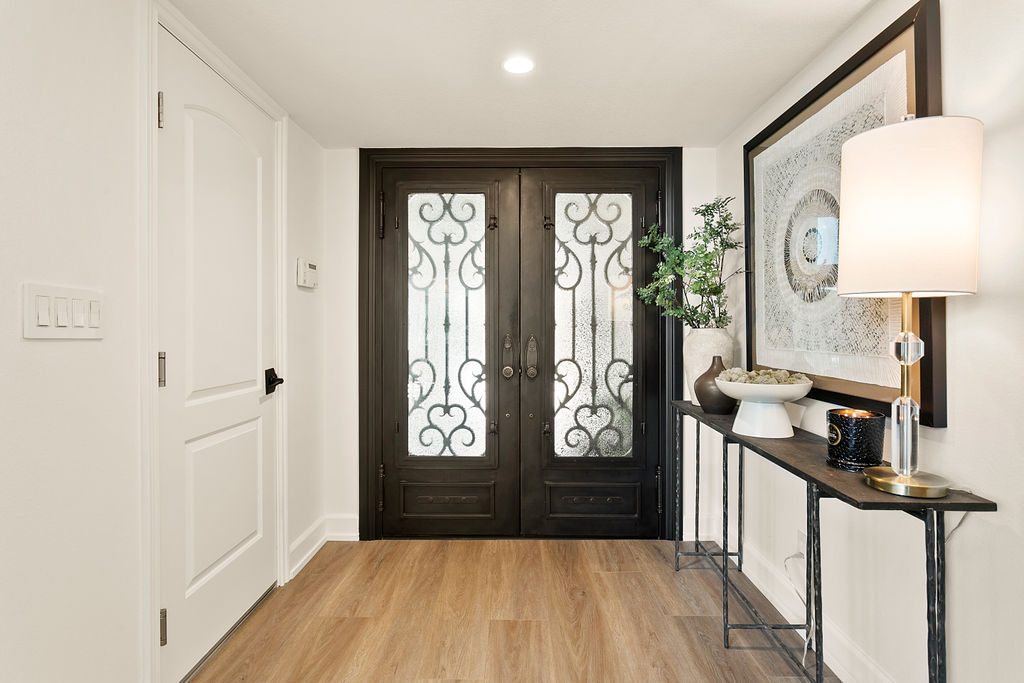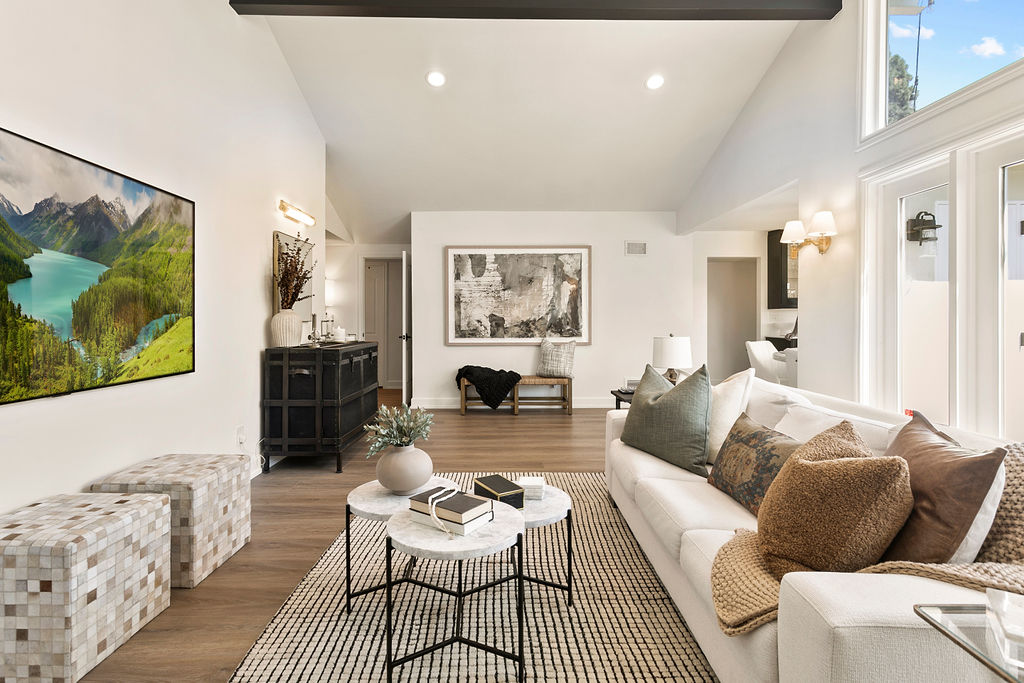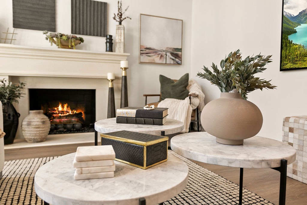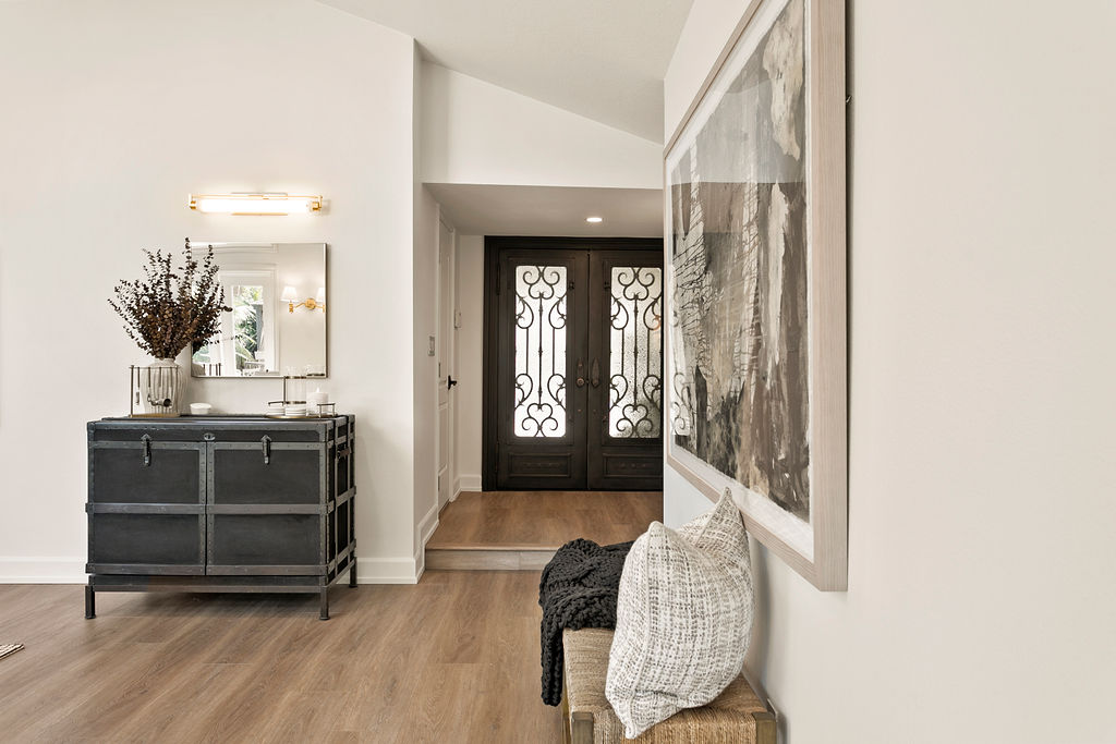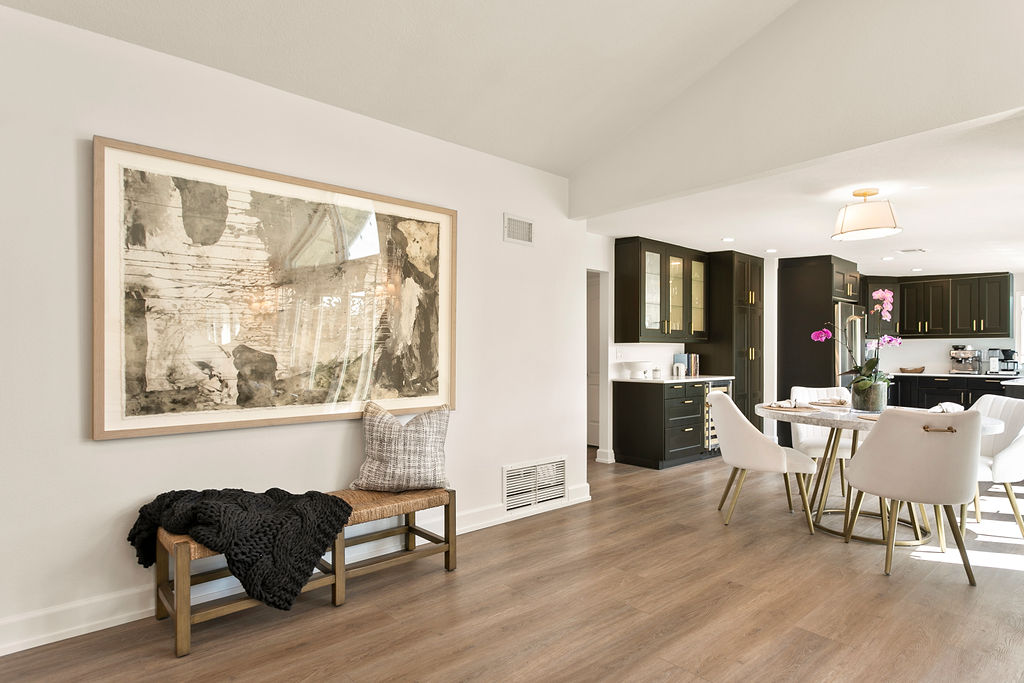 This project showcases a beautifully designed living space with a seamless flow between rooms, offering a combination of modern style and cozy elements that create an inviting atmosphere. Upon entering, the space opens up to a well-lit foyer, featuring a stunning rice paper artwork framed and displayed above a sleek console table adorned with minimalistic décor like plants and candles. The kitchen flows into the dining area with a sophisticated marble table and stylish white chairs, perfectly positioned under a pendant light, with large windows providing natural light and a view of the outdoor space.