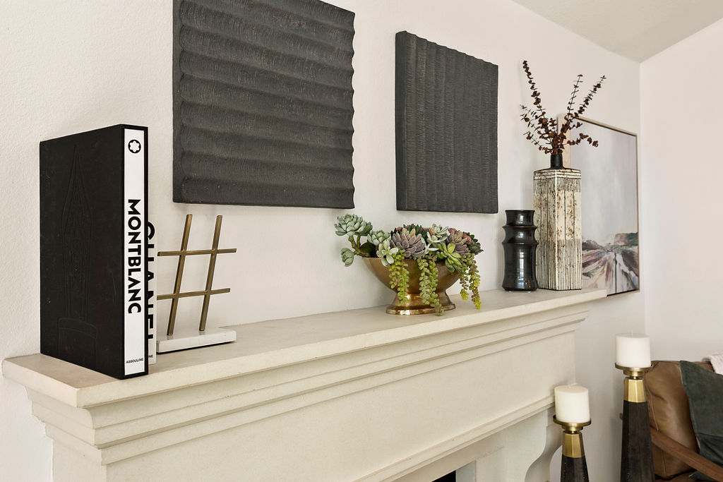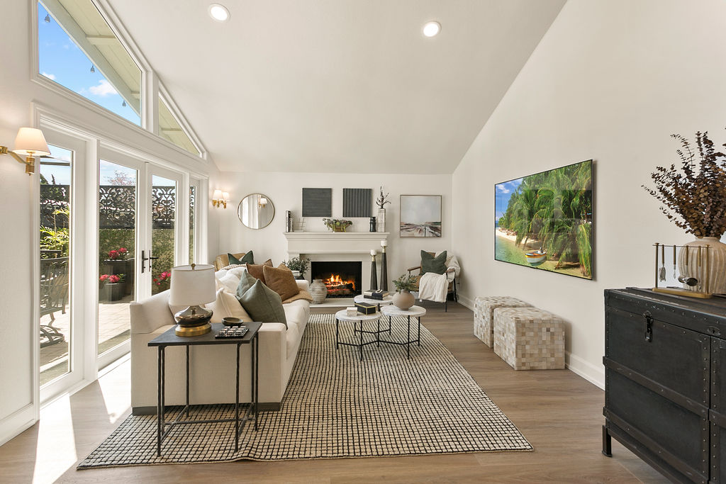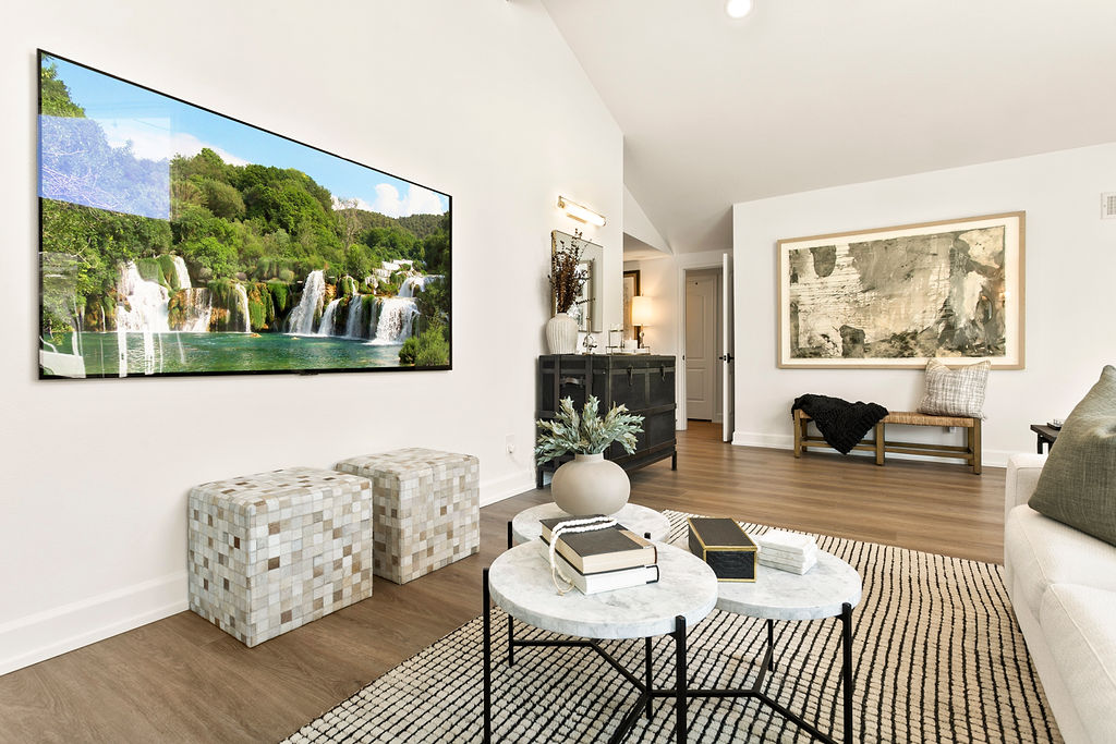 In the living room, the furnishings continue the clean, modern theme with neutral tones complemented by darker accents in the furniture and artwork. The space is anchored by a large fireplace, providing a cozy focal point for the room. On the adjacent wall, an expansive TV seamlessly blends into the contemporary décor, offering a luxurious yet practical touch. The living room also incorporates eclectic art pieces and natural elements like plants, adding warmth and life to the space.