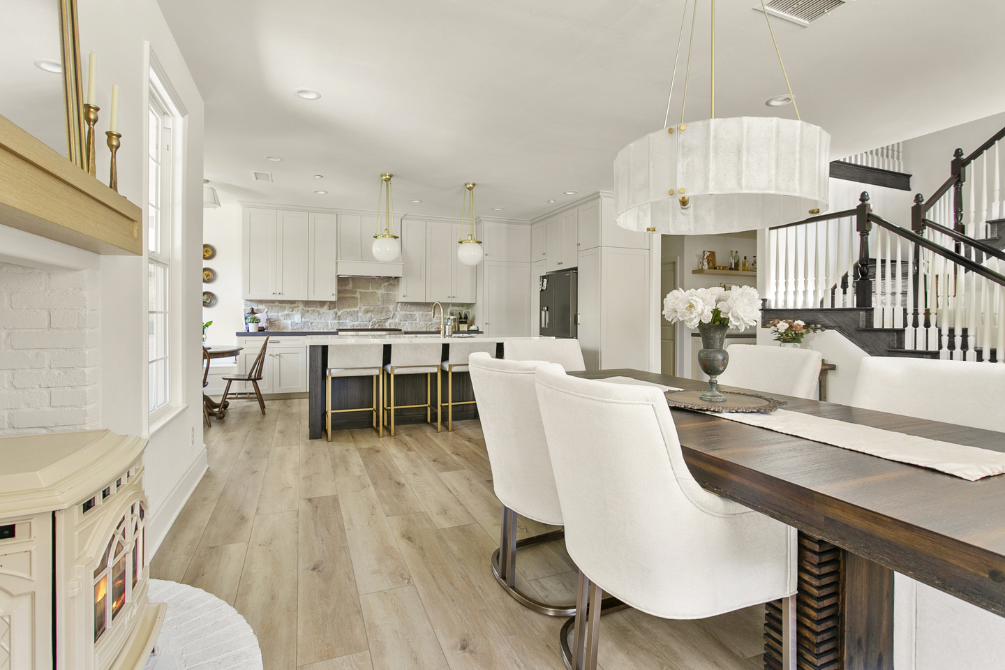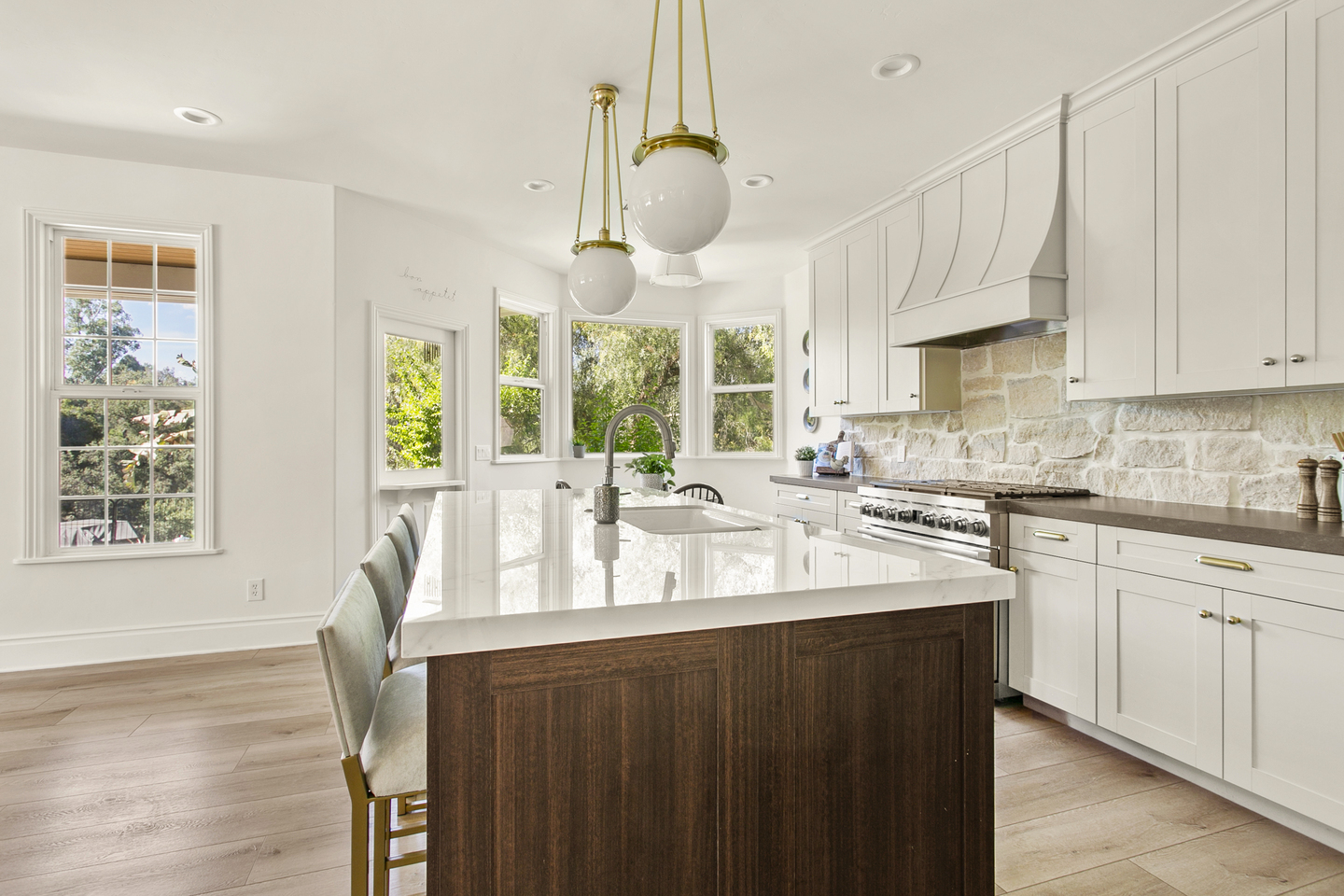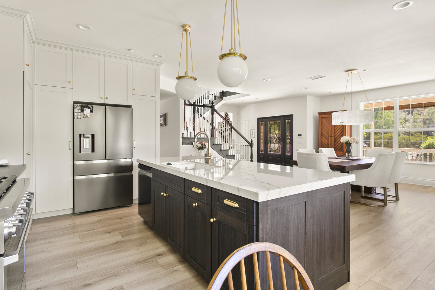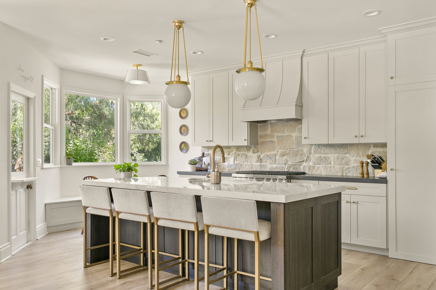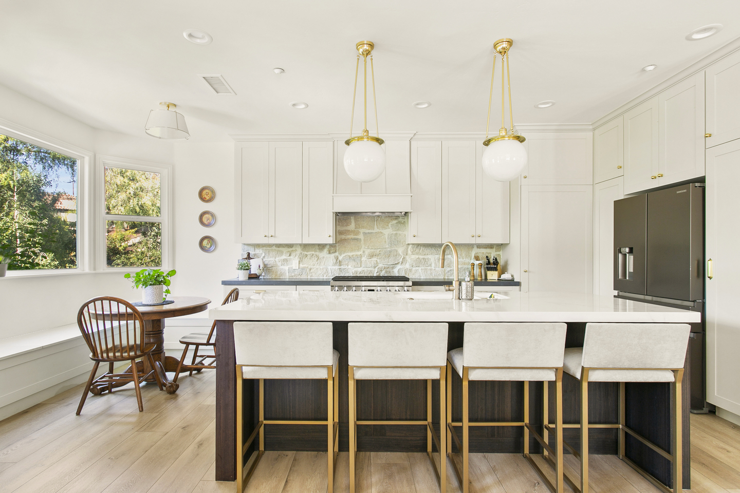 This beautifully redesigned kitchen, bar and dining area features a seamless blend of modern elegance and natural warmth. The spacious layout provides an open and inviting atmosphere, enhanced by abundant natural light streaming through large windows. The kitchen showcases sleek, custom cabinetry in soft white tones paired with a stone backsplash, complemented by the dark cabinetry at the island for a sophisticated contrast. High-end finishes such as gold hardware and pendant lighting add a touch of luxury, while the functional layout offers ample counter space for meal preparation and entertaining.