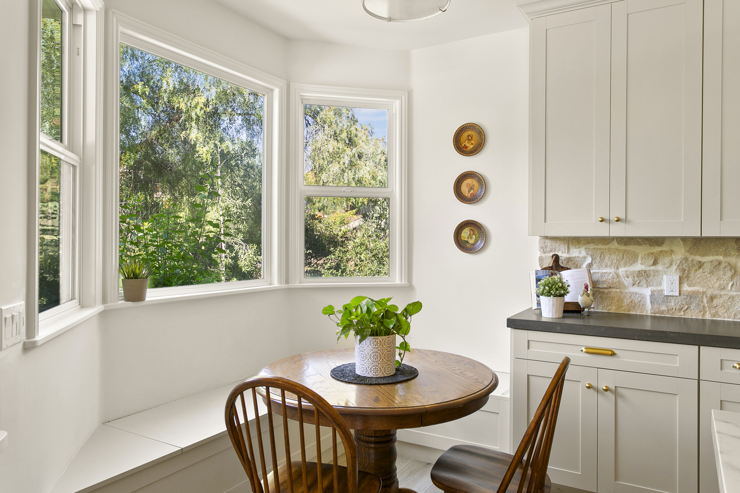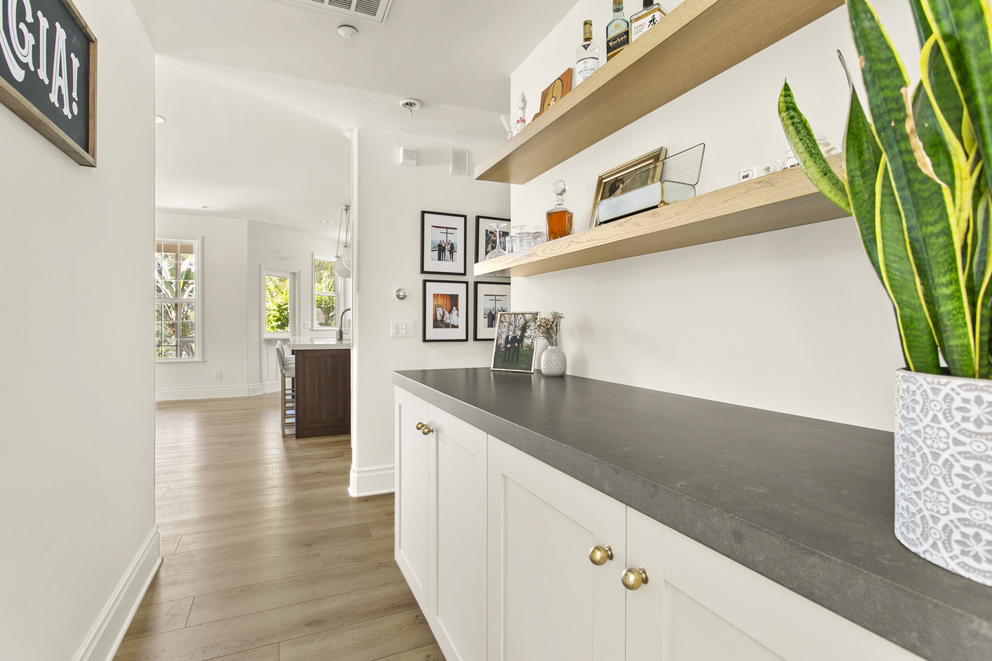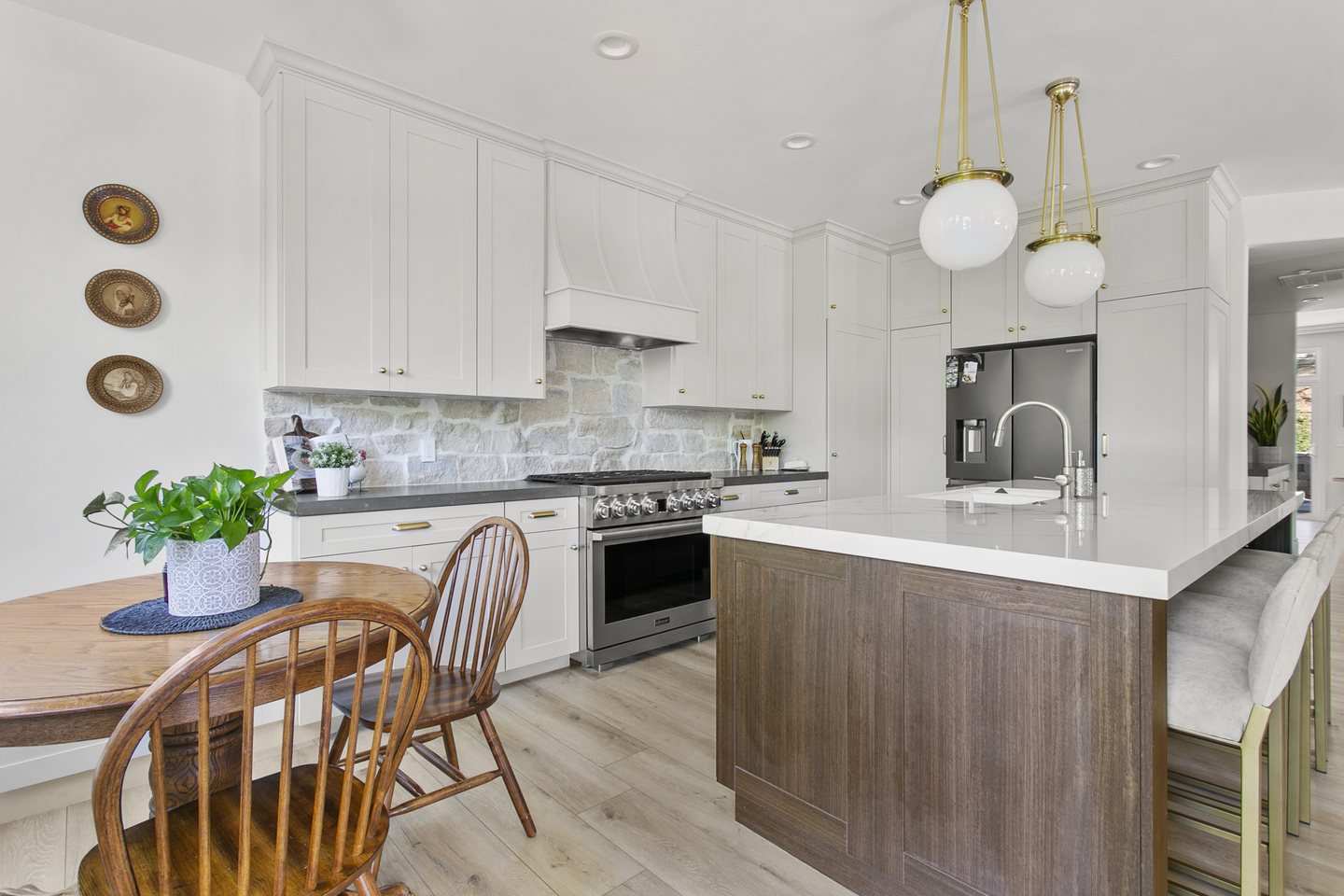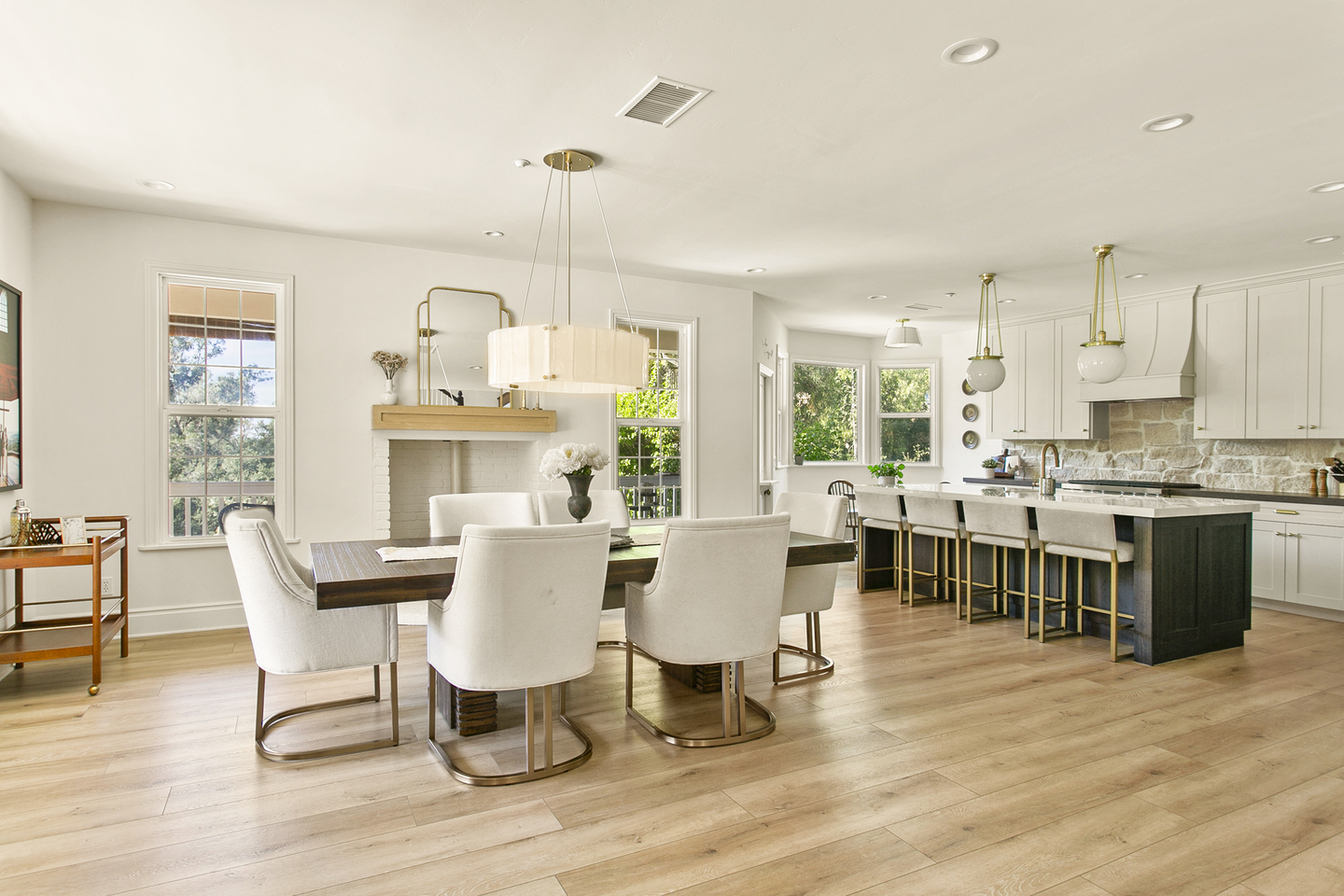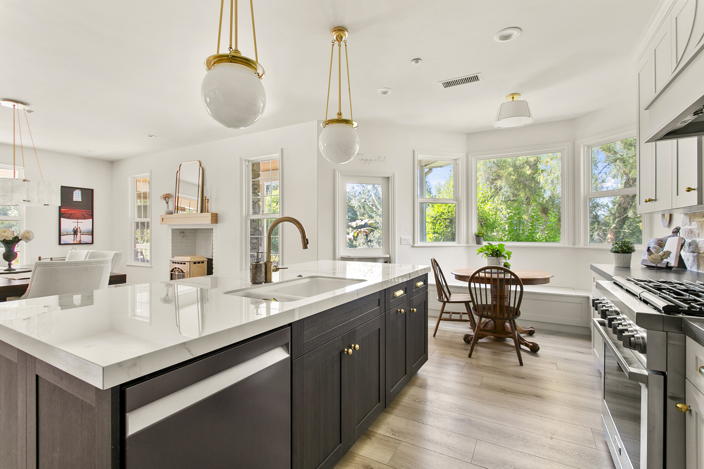 This beautifully redesigned kitchen, bar and dining area features a seamless blend of modern elegance and natural warmth. The spacious layout provides an open and inviting atmosphere, enhanced by abundant natural light streaming through large windows. The kitchen showcases sleek, custom cabinetry in soft white tones paired with a stone backsplash, complemented by the dark cabinetry at the island for a sophisticated contrast. High-end finishes such as gold hardware and pendant lighting add a touch of luxury, while the functional layout offers ample counter space for meal preparation and entertaining.