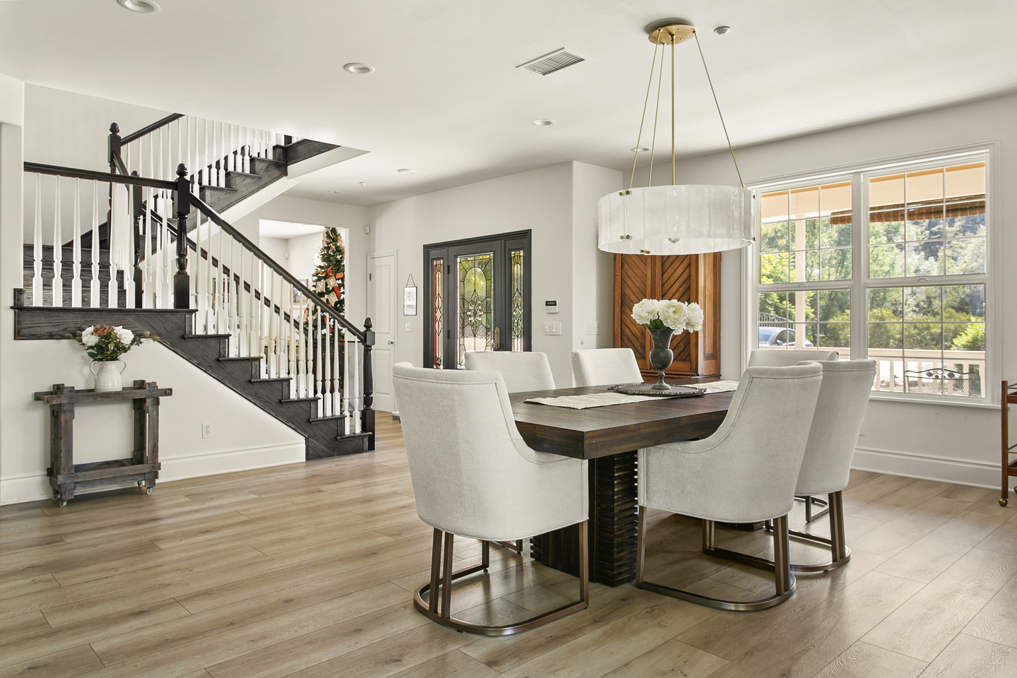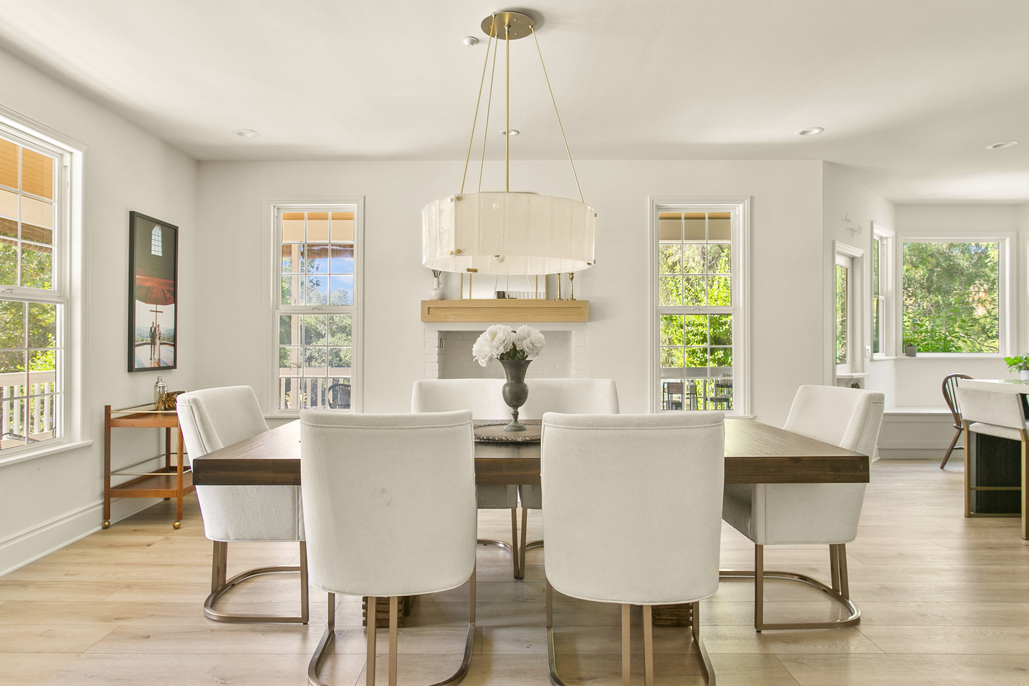 Adjacent to the kitchen, the dining area boasts a cozy, yet stylish setup with a statement chandelier above the table and modern, plush chairs. The room also integrates a functional seating nook, perfect for casual meals or moments of relaxation, offering a view of the lush surroundings. The entire space is designed for both everyday living and hosting guests, making it an ideal gathering spot for family and friends.