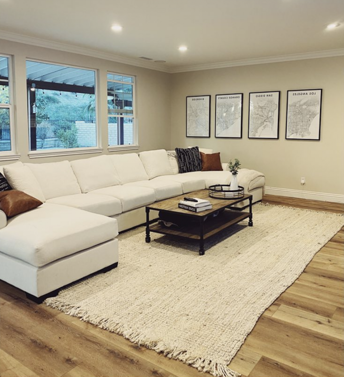 Adjacent to the kitchen is the living area, which is a perfect continuation of the open-plan design. Large windows flood the space with natural light, creating a bright and airy atmosphere. The carefully chosen furniture pieces offer comfort and style, making this the ideal spot for relaxing or entertaining. The design in this area emphasizes minimalism while still delivering a warm and inviting feel. The combination of earthy tones, modern lighting, and clean lines reflects a timeless, elegant aesthetic.