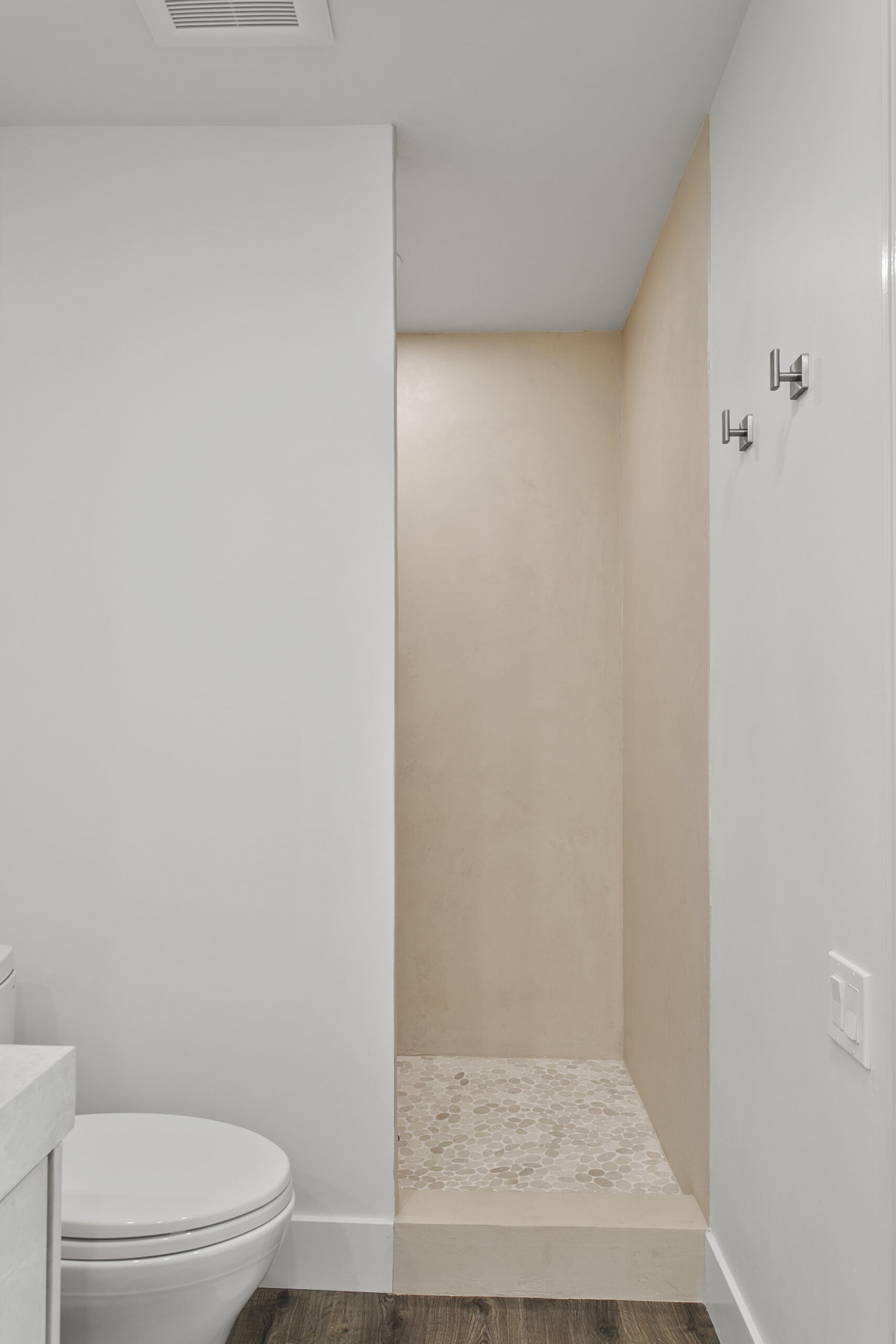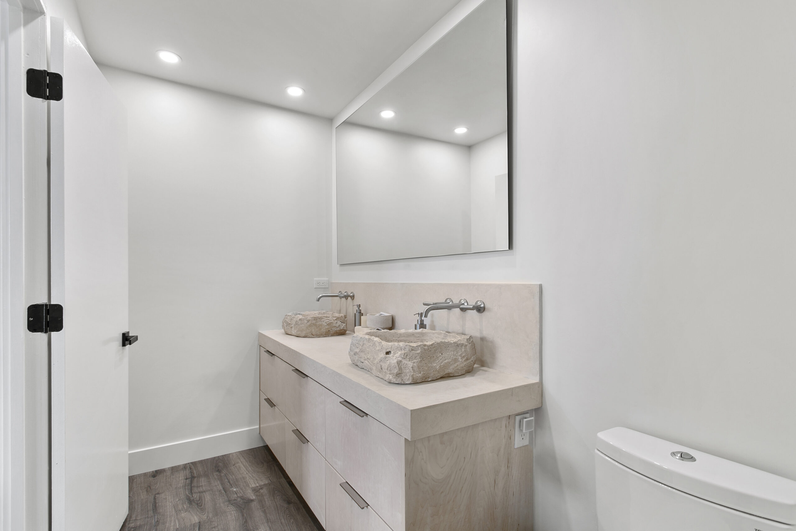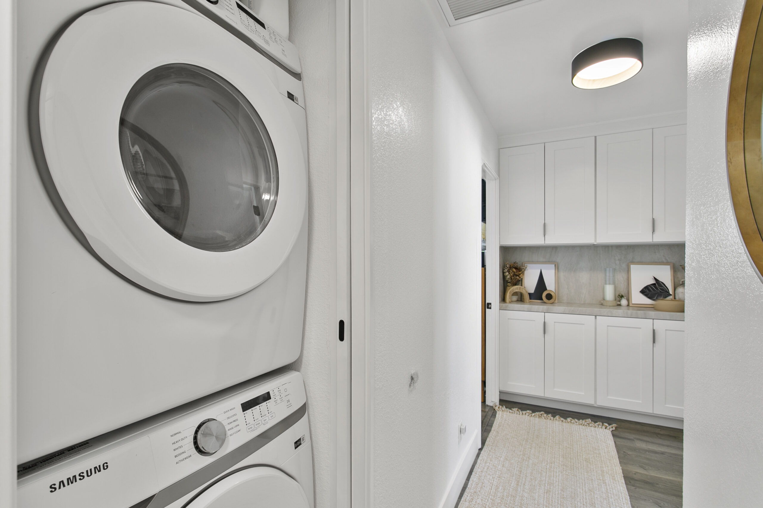 This project transforms everyday spaces into serene and functional areas. The laundry room features crisp white cabinetry that maximizes storage, paired with white walls for a clean, bright atmosphere. Neutral, warm-toned flooring enhances comfort and complements the cabinetry’s sleek finish.
